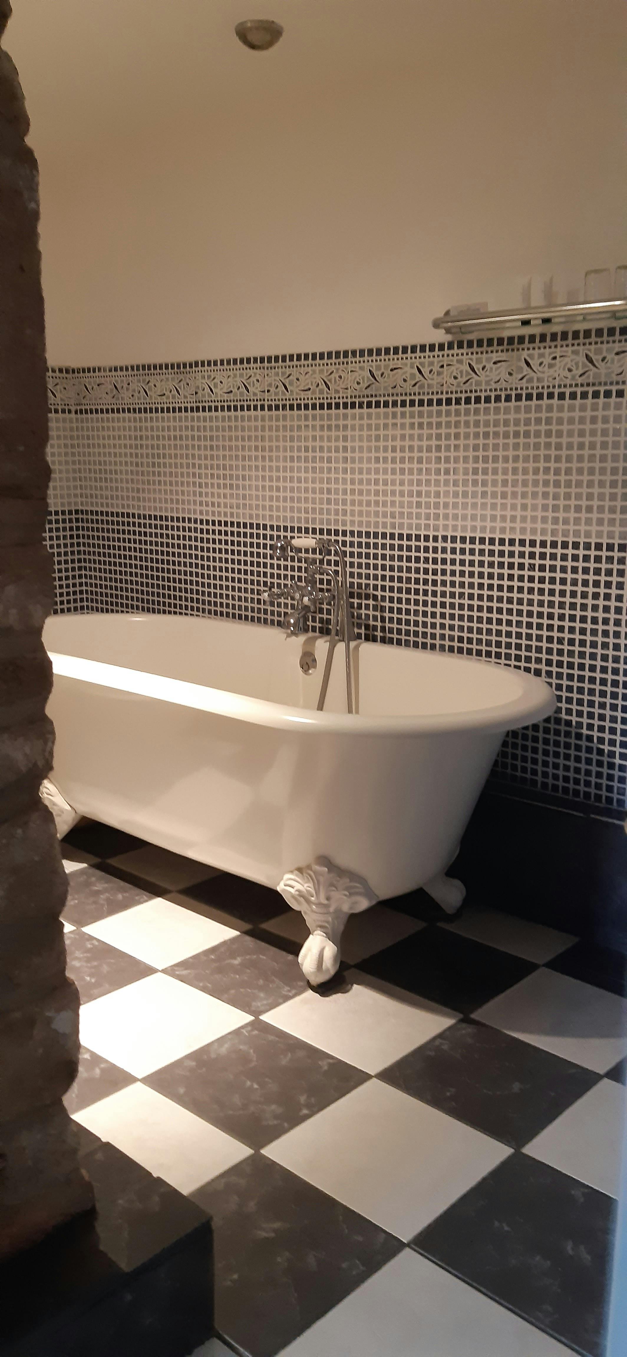 Located in the main house, this stunning chambre contains period features such as exposed oak beams, wonky door frames and lath plaster walls. Beautifully appointed with antique French furniture and king size bed and two noir armchairs. The Victorian styled bathroom (raised step to access) has a rolled top 'Victoria & Albert' bath ensuring a luxurious soak and pedestal basin. Tea&coffee making facilities, biscuits, blanket and fan are all available in the room. Flat screen TV with built in DVD player and superfast WIFI ensure you can remain as connected as required.