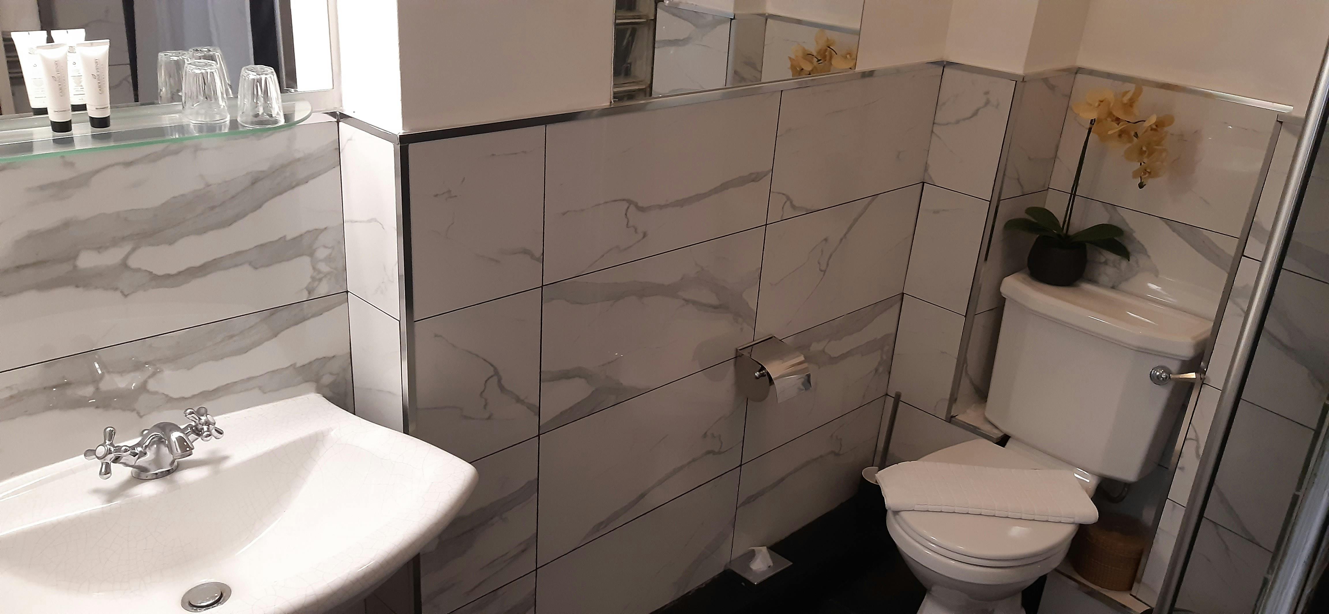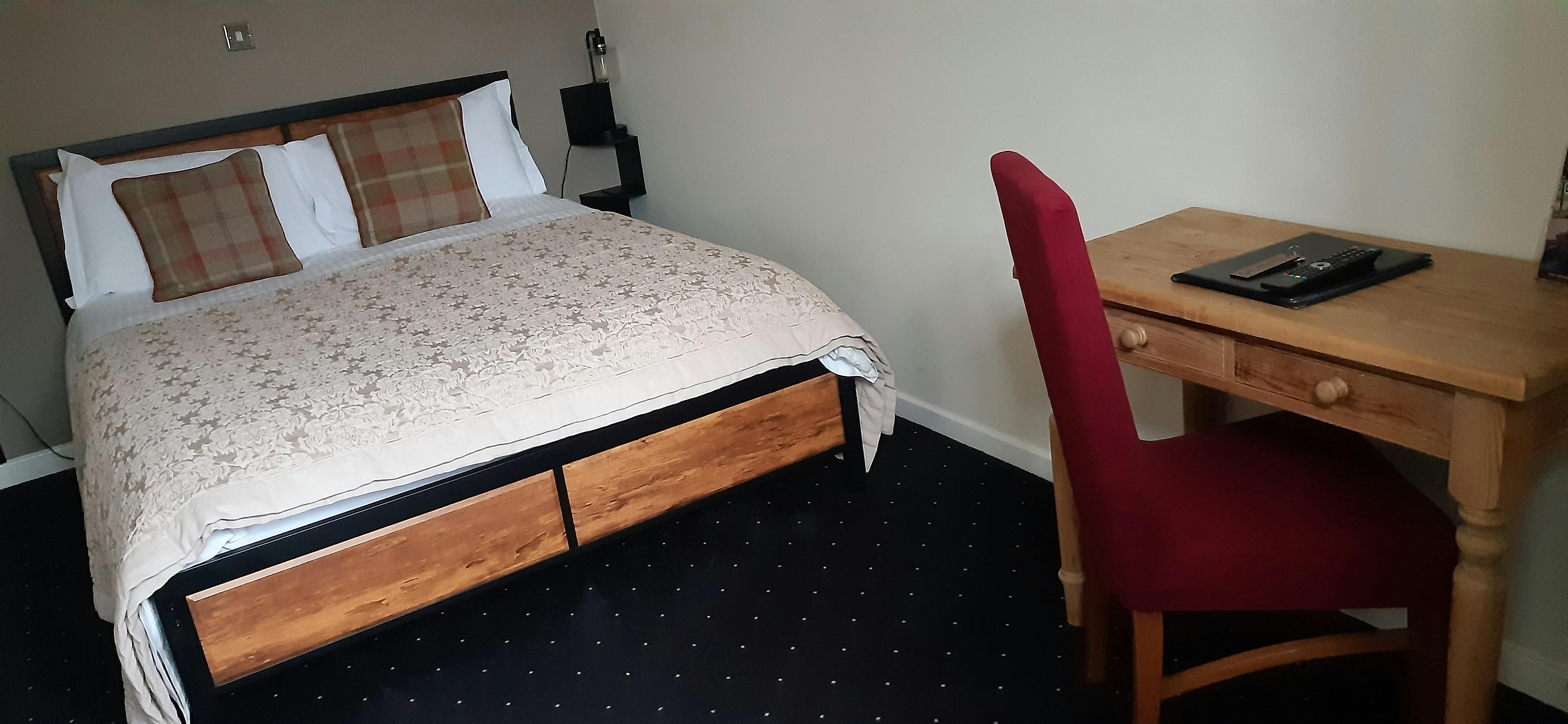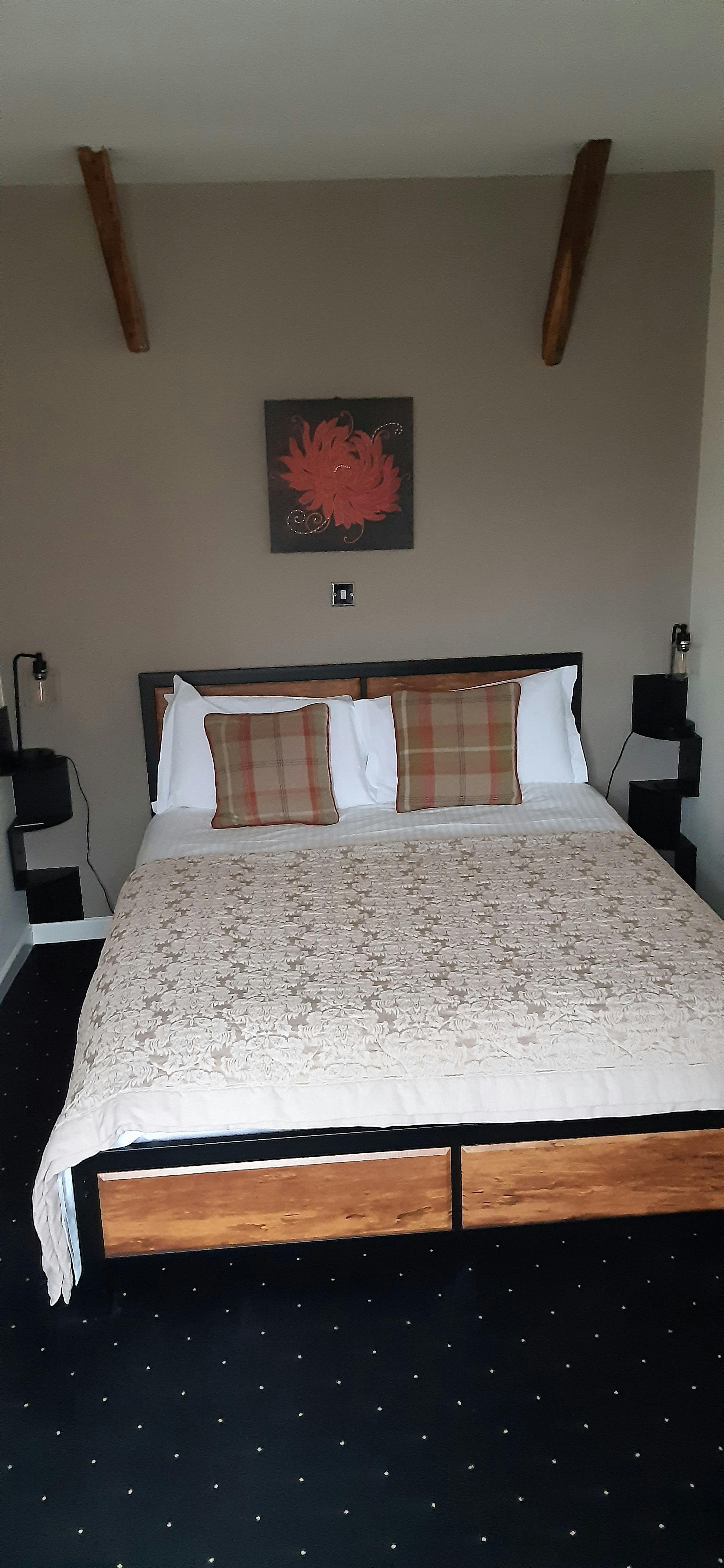 Another of our boutique double rooms and a guest favourite. A large slate tiled en-suite with underfloor heating, W/C, pedestal basin and walk in shower & complimentary cosmetics await. A modern King size bed, A writing desk and clothes storage rail, flat screen TV & superfast WIFI ensure a comfortable stay. This room also has the benefit of a modern fitted kitchen with fridge microwave and sink drainer allowing a self catering stay/room service breakfast if desired.